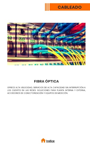 CABLEADO FIBRA ÓPTICA OFRECE ALTA VELOCIDAD, SERVICIOS DE ALTA CAPACIDAD SIN INTERRUPCIÓN A LOS CLIENTES EN LAS REDES. SOLUCIONES PARA PLANTA INTERNA Y EXTERNA, ACCESORIOS DE CONECTORIZACIÓN Y EQUIPOS DE MEDICIÓN. Indice