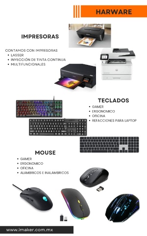 HARWARE IMPRESORAS CONTAMOS CON IMPRESORAS LASSER INYECCIÓN DE TINTA CONTINUA MULTIFUNCIONALES TECLADOS GAMER ERGONOMICO OFICINA REFACCIONES PARA LAPTOP MOUSE GAMER ERGONOMICO OFICINA ALAMBRICOS E INALAMBRICOS www.imaker.com.mx