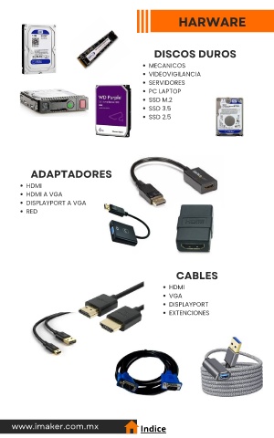 HARWARE DISCOS DUROS MECANICOS VIDEOVIGILANCIA SERVIDORES PC LAPTOP SSD M.2 SSD 3.5 SSD 2.5 ADAPTADORES HDMI HDMI A VGA DISPLAYPORT A VGA RED CABLES HDMI VGA DISPLAYPORT EXTENCIONES www.imaker.com.mx Indice